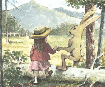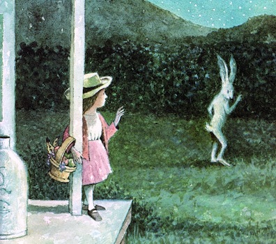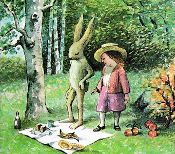 For one thing, there’s the rabbit himself: he’s nearly human in his size and posture. Where another illustrator might have given us a smiley bunny in a funny hat, Sendak has created an earnest and handsome, if still cotton-tailed, hero. It somehow seems completely natural that he and the heroine should converse, stroll through a forest together, share a woodland picnic. There’s something innocently romantic about their day out, particularly when it deepens into a summer twilight.