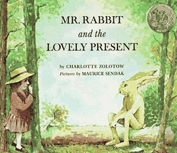 I’m sure that countless blog posts about Sendak were written today, and I’d guess that his masterpiece Where The Wild Things Are was the book most frequently mentioned in those posts (and in the actual obituaries, such as this one in The New York Times). I owned and loved Wild Things, of course, as well as Else Holmelund’s Minarik Little Bear series, illustrated by Sendak. My brother, three years younger, added The Sign on Rosie’s Door, In the Night Kitchen, and the “Nutshell Library” of four mini-books (Pierre, Chicken Soup with Rice, et al.) to our collection. Yet the book that made the first and perhaps deepest impression on me was Mr. Rabbit and the Lovely Present, for which Maurice Sendak illustrated a story by Charlotte Zolotow.