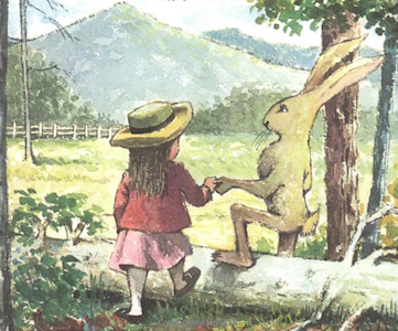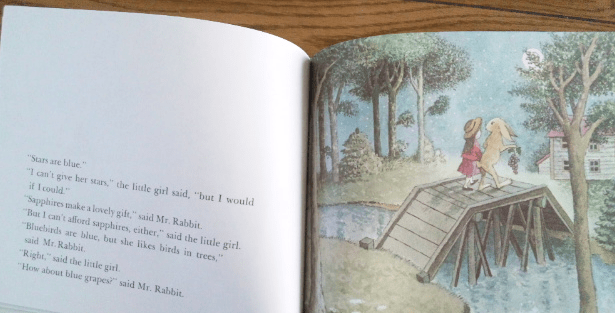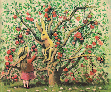 Zolotow’s story is simple and sweet: a young girl, trying to decide on a birthday present for her mother, seeks Mr. Rabbit’s help. The two spend a day together puzzling over the possibilities. When Mr. Rabbit asks the girl what her mother likes best, the girl names various colors. But if you can’t give an actual color as a gift, what can you give? Mr. Rabbit suggests various items for each color, many of them exciting but improbable (a yellow taxicab!). The rabbit and the girl cooperate in gathering and assembling various bright pieces of fruit into a gift basket, and they part at nighttime with their task accomplished.