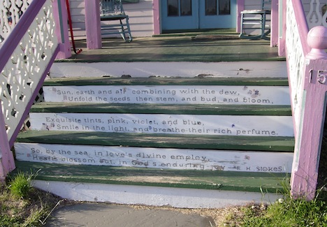 Speaking of scent, I was also happy to spy this inscription painted on the front steps of a Victorian house located less than a block from the ocean. Its author, E. H. Stokes, was the first President of the Ocean Grove Camp Meeting Association.