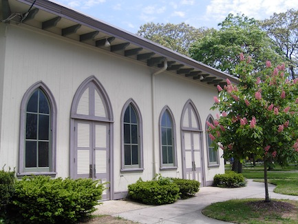Much of Ocean Grove‘s character stems from its beginnings as a Methodist camp meeting site in the 1860s. Its history is most evident in the cluster of religious buildings around the town’s central square (like the Bishop Janes Tabernacle, above) and in the Biblical names of the surrounding streets. Ocean Grove’s Camp Meeting Association still prohibits the sale of alcohol within town limits, and the beach is closed on Sunday mornings.