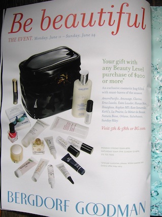 The latest Bergdorf Goodman look-book just arrived in my mailbox, so I thought I’d mention Bergdorf’s upcoming beauty event. It runs from Monday, June 11 through Sunday, June 24, and with any Beauty Level purchase of $200 or more, you’ll receive a cosmetics bag filled with deluxe beauty samples.