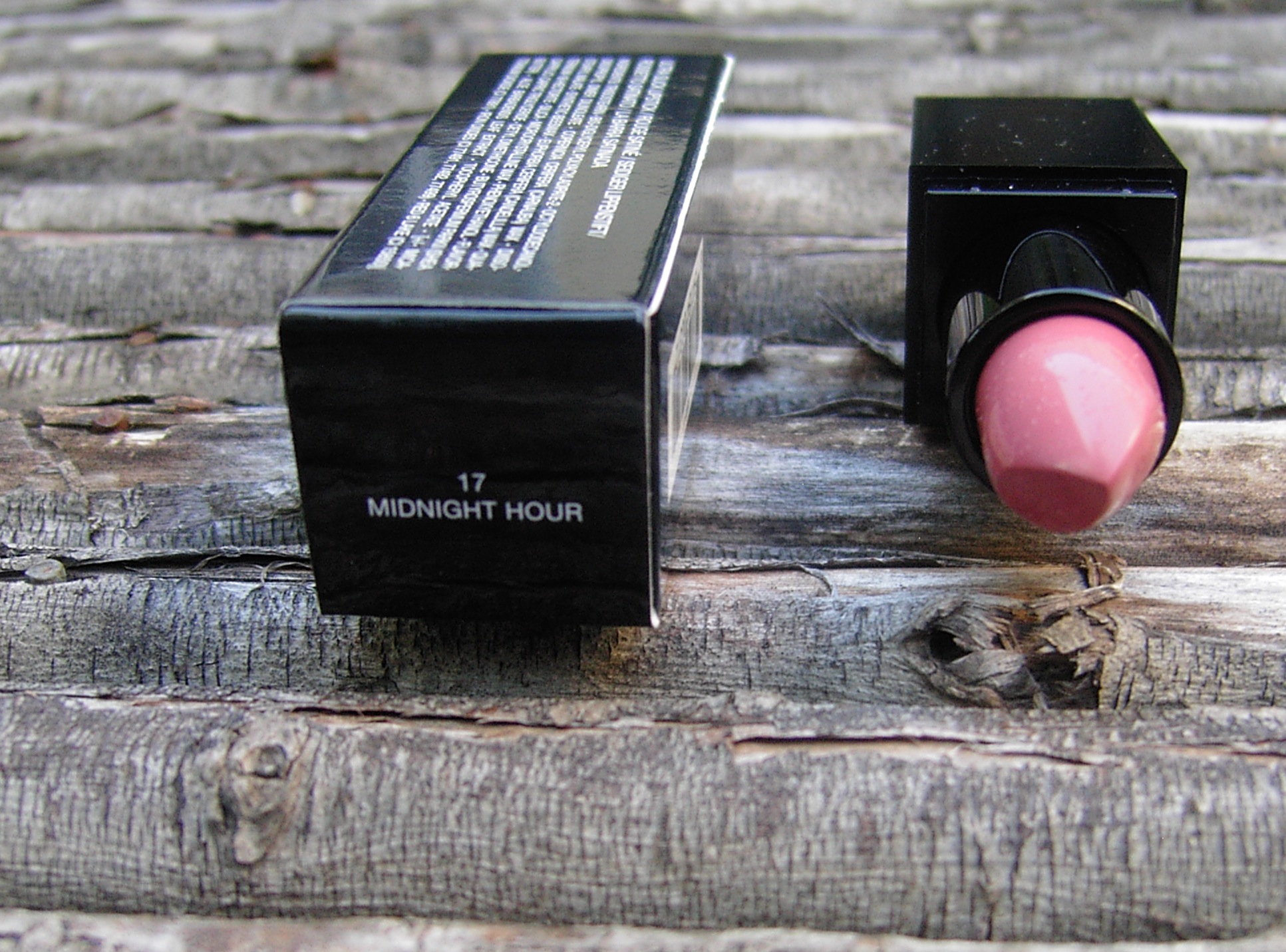 I tried on two or three shades and came home with Midnight Hour (17), a “neutral pink.” It really is neutral, without being beige or “nude”: it’s just a perfect balance of cool and warm in a medium pink/blush shade. For reference, I already own Rose Demure (14), a cool rose-petal pink; Midnight Hour is slightly warmer and just a touch deeper than Rose Demure. Since my skintone is a tricky combination of warm and cool (it occasionally puzzles some less-experienced makeup artists), I’m always happy to find shades that flatter my face rather than making me look ruddy (on one hand) or sallow (on the other).
