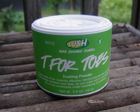 One of my favorite foot-specific products is T for Toes, a loose powder from LUSH. I’ve purchased it several times over the years. It’s basic and effective and (nearly) all natural, and one canister lasts for months. I like to sprinkle a bit of T for Toes on my clean, bare feet in the morning—a little goes a long way in eliminating stickiness and slipperiness. (You could also dust some T for Toes directly into your shoes before putting them on.)
