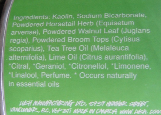 The main moisture-fighting ingredients in T for Toes are the kaolin (a type of clay, in powdered form), sodium bicarbonate (baking soda!), and various powdered botanicals. T’s zingy, tart scent comes from a blend of tea tree oil and lime oil. (I think I can also detect some lemongrass in there.) It’s a nice alternative to mainstream deodorizing products with overpowering, synthetic “powder fresh” or “shower clean” scents.