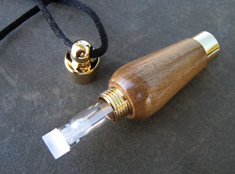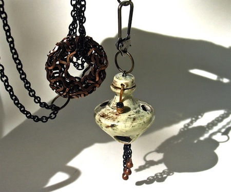 This is a more functional-looking pendant, and in fact it can be attached to a key chain when you’re not wearing it on a neck cord. It provides an ingenious solution to the perfume-transport problem: its cap unscrews to reveal a compartment for a standard glass perfume vial. You can view more photos and details on Grainwork’s Etsy account. What scent would I put in this one? Anything! ($29)