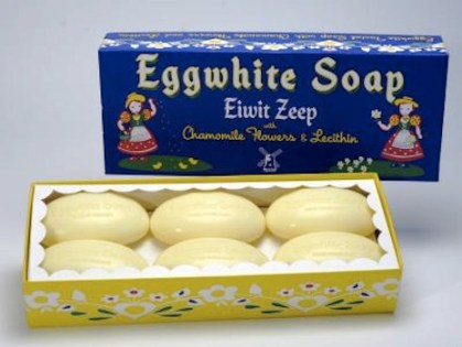 Then something even odder happened: Bigelow and New London, as well as online sources that I found through Amazon, were instead stocking something that looked similar to Eggwhite Facial Soap. It had same size box, with six small soaps nestled inside a scalloped border, and a folk art-inspired cover printed in blue and red and yellow with two girls instead of two hens. The ingredients of this “Eggwhite Soap” were also similar, but not identical. Hm.