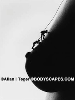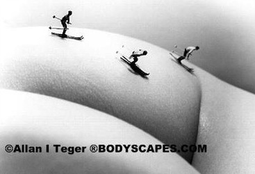 These “bodyscapes” by the “self-taught photographer” Allan I. Teger (as you can see by the copyright information!) play with scale by placing miniature human figures on a nude body.