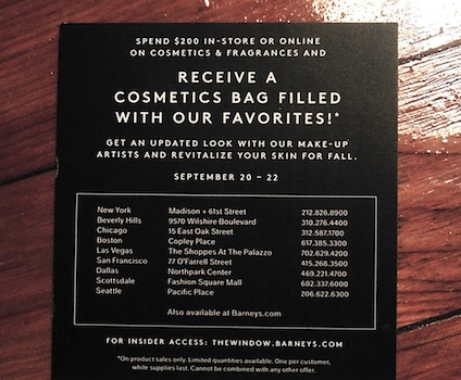 If you spend $200 on cosmetics and/or fragrance on these days, you’ll receive a cosmetics bag filled with deluxe samples of beauty products.