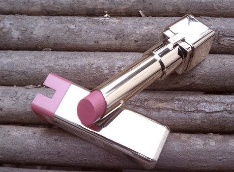 My choice, Rose Taffeta, is a cool-toned rose-mauve with a satin finish. Each Colour Caresse case has a colored band that corresponds with the lipstick inside. I’m not crazy about the shiny gold-coated plastic exterior, or the design of the skinny tube inside the long top cap, but the color and texture of the lipstick inside are enough to get me past my aesthetic nitpicking.