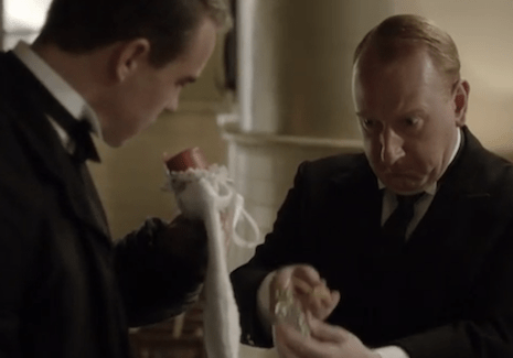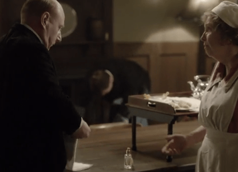 While the cook, Mrs. Thackeray, discusses Lady Holland’s inappropriate (and unhygienic!) choice of a taxi for her ride home, butler Mr. Pritchard places a bottle of perfume (complete with atomizer pump) on the kitchen table. Why?