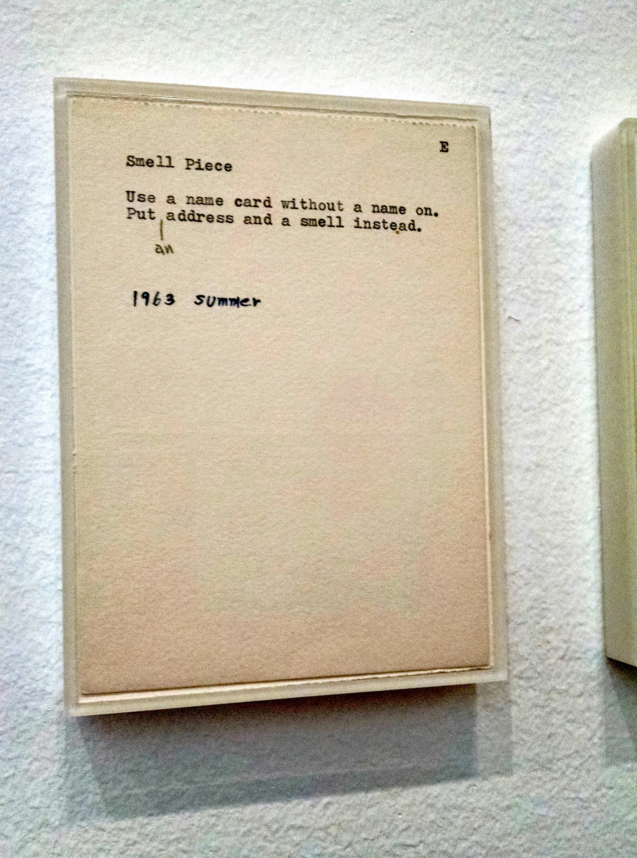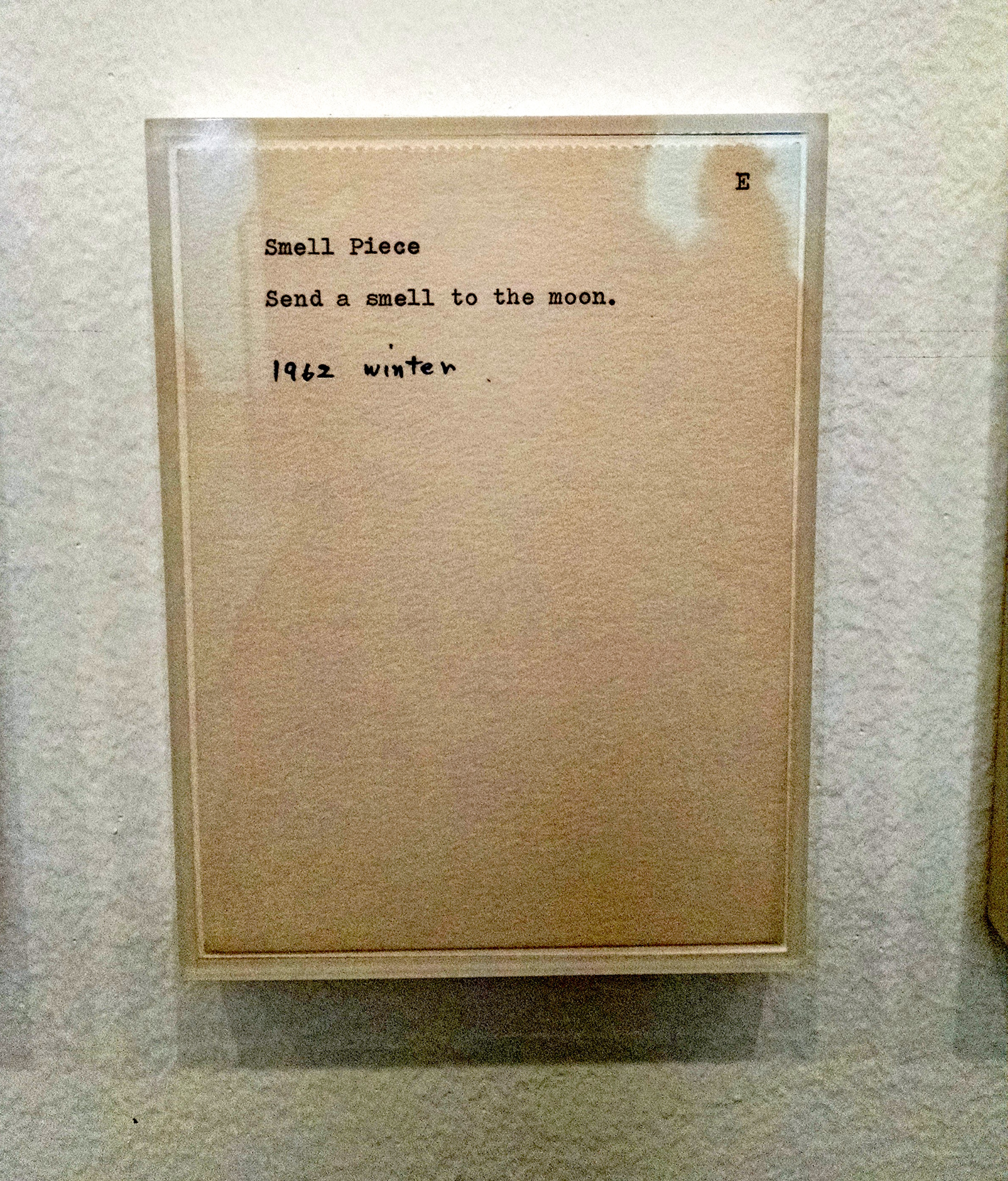 I spent a while looking at a long series of works that are actually instructions for making art–typed out on ordinary pieces of paper. Ono made them in the early 1960s. Some of the directions are fanciful yet possible; others are purely poetic. All of them remind us that anyone can make art and that art can be many things other than a painting or a sculpture. It can be an experience.IMG_20150512_110511303Some of the proposed works involved movement or sound; many of them suggested interactions with the natural environment. I was particularly pleased by these instructions for composing “Smell Pieces.” Here are a few that I photographed.