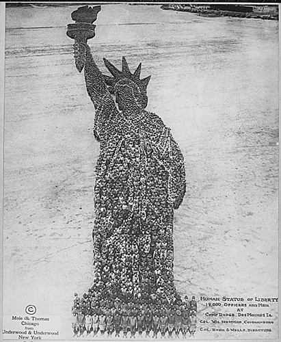 Image: Human Statue of Liberty. 18,000 Officers and Men at Camp Dodge, Des Moines, Iowa. Mole & Thomas, 09/1918. Via the U.S. National Archives.