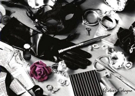 Those visuals usually seem quite personal, as though the owners of Atelier had composed them from favorite possessions. (In fact, I believe they did do this for the initial group of fragrances, at least.) However, the photograph for recent launch Rose Anonyme has me raising an eyebrow. One one hand, it’s a bit generic: the items don’t really seem to belong to anyone. On the other hand, there’s something oddly familiar about the appearance of a mask, a set of handcuffs, and a key, all processed into grisaille.